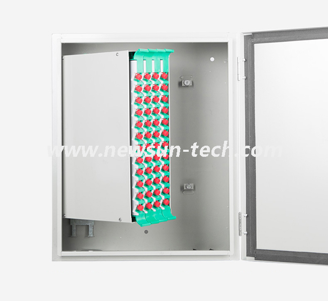 Fiber optic SMC cabinet max up to 12/24/48 trays, 12 ports one tray, total 144/288/576 ports, FC or SC adapter can be installed.with pigtails and adapters contain one ODF, adapters and pigtails. Parts are shipped separately, The installer assembles the pigtails and adapters in the ODF on site. Boxes can be supplied to contain from 12 to 192 fibers. All ODFs are withdrawable and designed for mounting in 19” racks. They are equipped with splice holders and guiding for fibers.