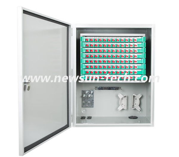 Fiber optic cabinet max up to 12/24/48 trays, 12 ports one tray, total 144/288/576 ports, FC or SC adapter can be installed.with pigtails and adapters contain one ODF, adapters and pigtails. Parts are shipped separately, The installer assembles the pigtails and adapters in the ODF on site. Boxes can be supplied to contain from 12 to 192 fibers. All ODFs are withdrawable and designed for mounting in 19” racks. They are equipped with splice holders and guiding for fibers.