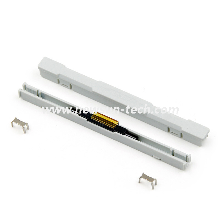 Universal optical mechanical splice is developed for mechanical connection of optical fibers with a diameter of primary protection from 250 μm do 900 μm. It is filled with a special gel with the same refractive index as glass. Mechanical splice allows quick and stable connection of two optical fibers by simply pressing the loping lid without separate installation tool. Newsun tech 's L925 Optical Fiber Mechanical Splicer is a mechanical splice that provides an inexpensive, quick alternative to mating fibers. Using V-groove technology, this splice maintains physical contact between the fibers.We provide a precise, simple and low cost method of mechanically splicing optical fiber. Fiber can be spliced simply in this way in a very short time. It can be used for 900/900µm ,250/250 µm, 250/900 µm fibers.