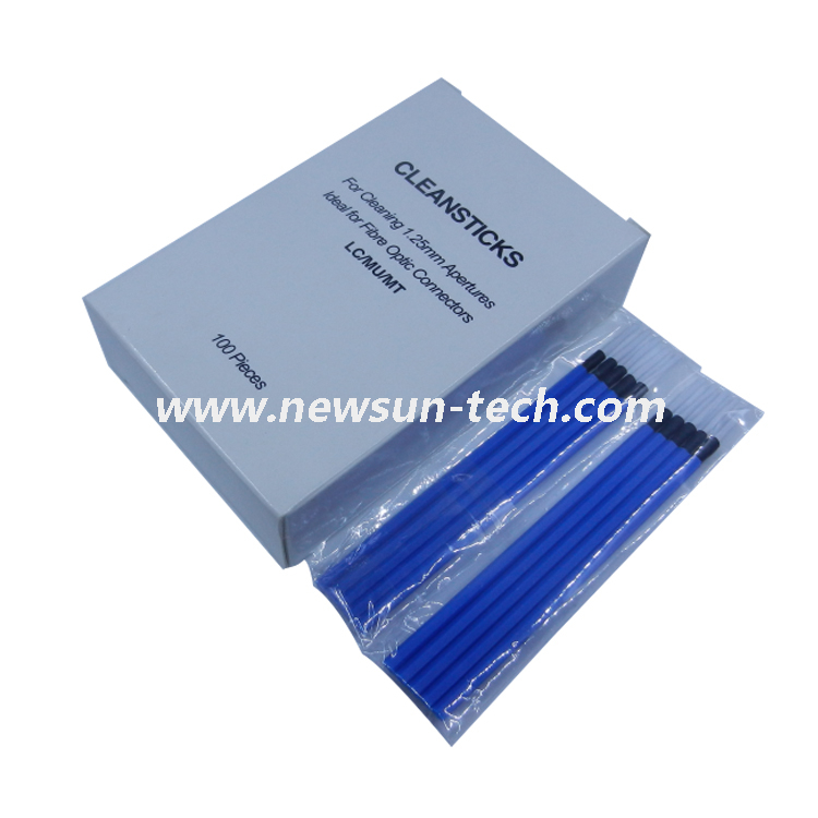 Cleaning sticks are an easy and efficient means of cleaning fiber optics connectors in adapters and cleaning alignment sleeves. They are available in sizes for most common commercial connectors (ST, SC, FC, LC, MU), military connectors, and LEMO connectors for video applications. When connectors need to be cleaned inside adapters, you can rely on the Newsun Tech stick.