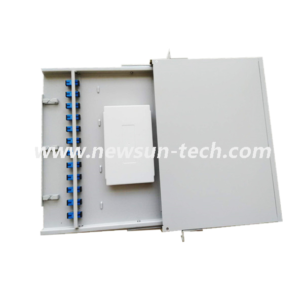 19-inch rack mount for SC, LC adapters. The drawer is the holding board for splicing, easy to withdraw the fibers when testing and distributing.Its used to distribute and protect the optical fiber links in FTTH Network. It is available for the distribution and terminal connection of various kinds of optical fiber system. The terminal box is a high quality, miniature optical fiber terminal box, made of quality cold-rolled sheet and Electrostatic painting of plastics. The box can only be installed in a rack mount chassis.